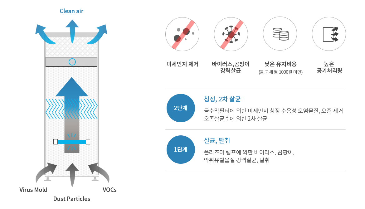 연구소, 병원, 학교시설, 사무실 등에 공기 속 미세먼지, 미생물 (박테리아, 바이러스, 곰팡이)까지 동시에 제거하는 중규모 공기살균/청정 장치
